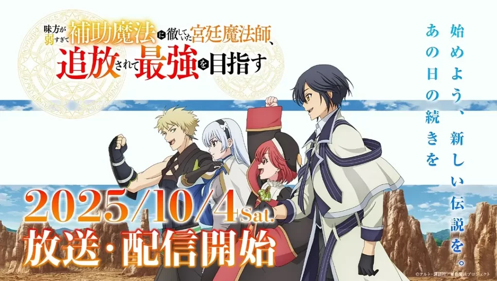 2025 年 3 月 21 日,讲谈社正式公布动画化消息,原作者アルト特别发布致谢文,提及 “从网络连载到动画化,离不开读者支持”,角色原案夕薙绘制纪念插画 —— 亚历克站在迷宫入口,身后是尤尔哈等伙伴,配文 “传奇队伍即将复活”,瞬间引发热议,# 補助魔法師アニメ化 #话题在 Twitter 获得 21 万条讨论。同年 10 月 3 日,ABEMA 平台直播开播前特别节目,梅田修一朗、久保由利香等声优解读角色,分享配音时的细节考量,进一步提升作品关注度。